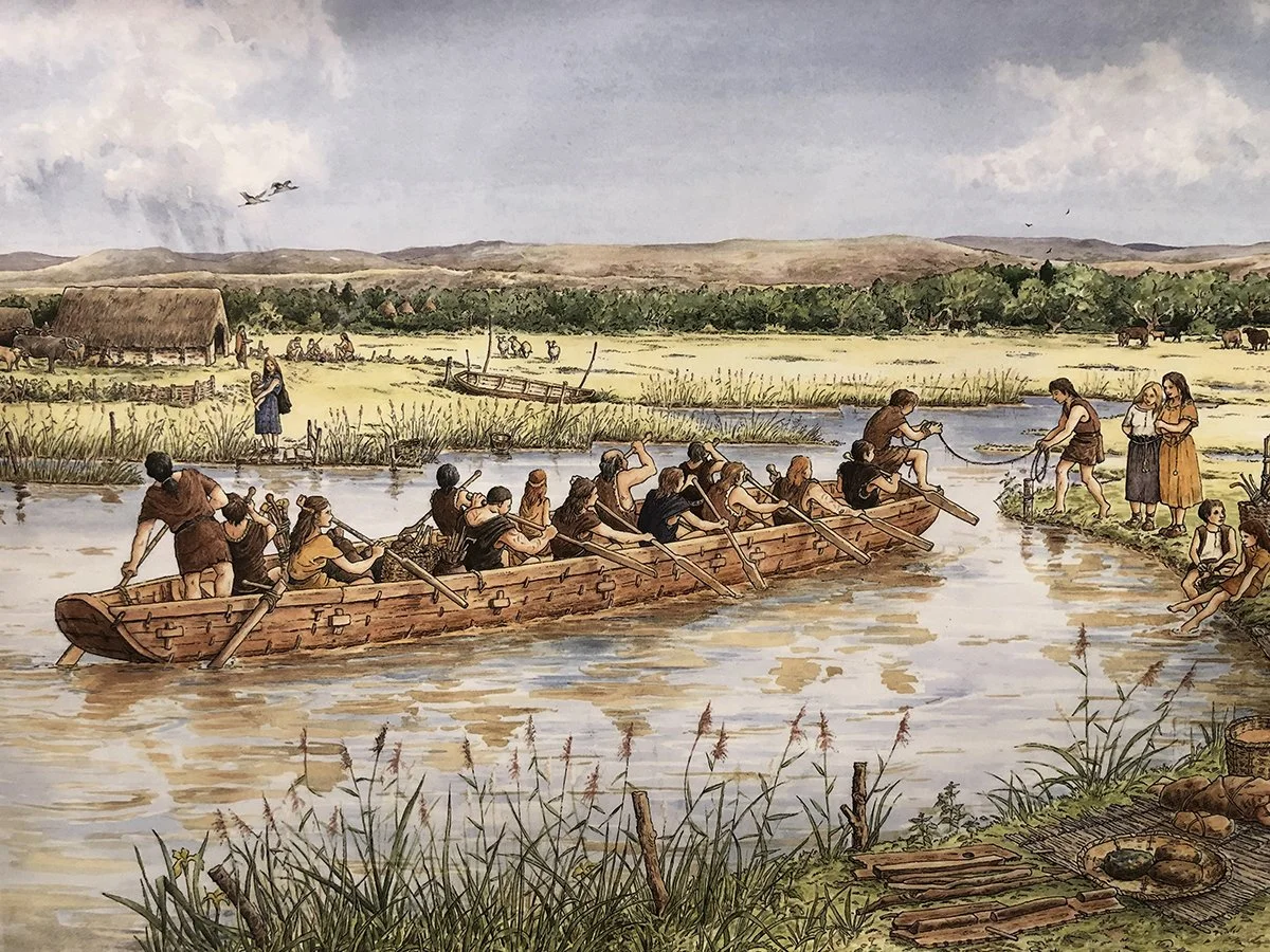 Delwedd arlunydd o gwch planc wedi'i wnïo o'r Oes Efydd (Trwy garedigrwydd Amgueddfa Llongau Canoloesol Casnewydd)
