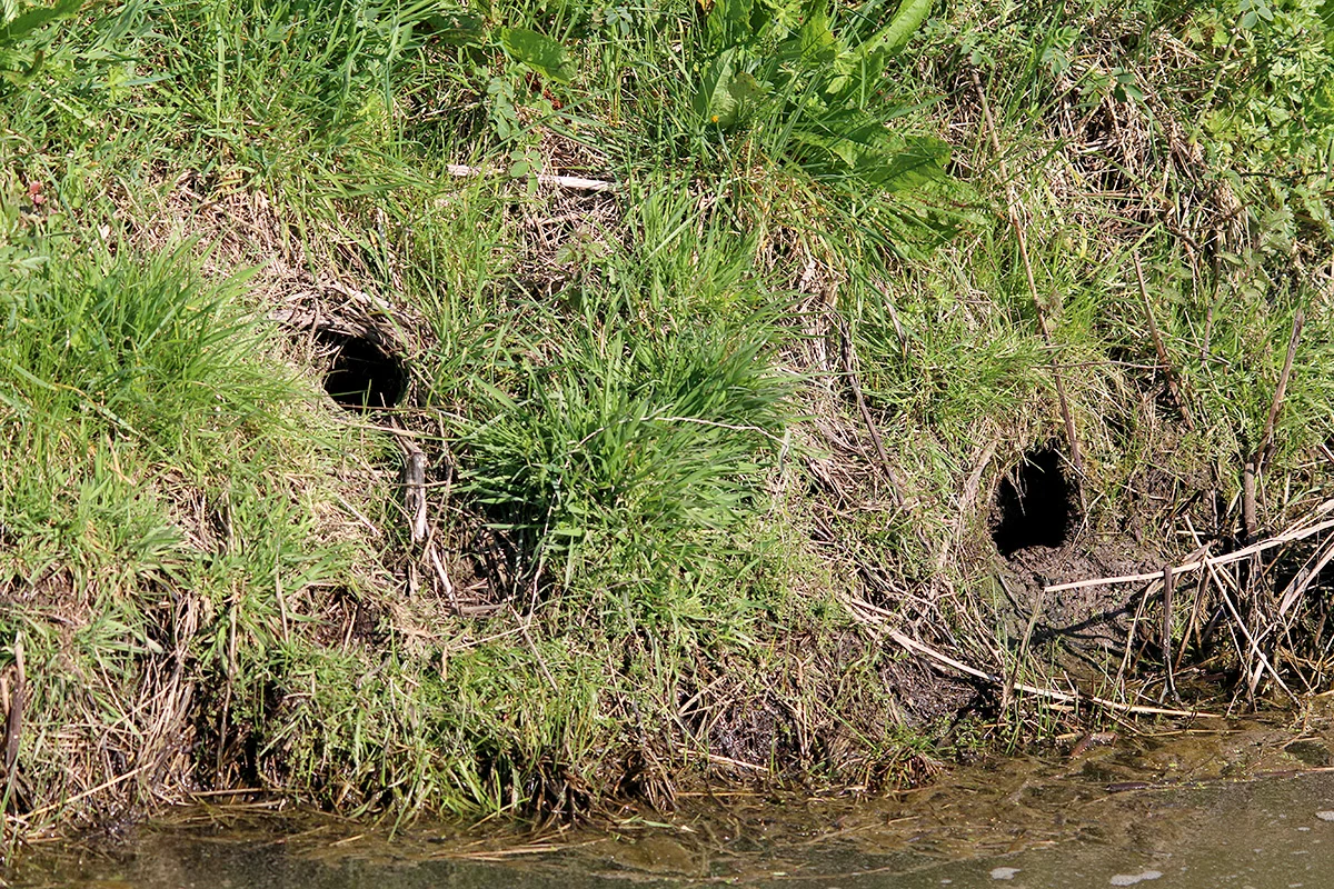 Mae llygod pengrwn y dŵr yn byw’n rhannol ar y tir a rhannol mewn dŵr ac fel rheol ni fyddant yn crwydro mwy nag ychydig fetrau i ffwrdd o ddŵr. Maent yn creu tyllau ar hyd llethrau serth, yn aml gydag allanfa ger ymyl y dŵr er mwyn gallu dianc yn gyflym. Maint pêl tenis yw mynedfa’r twll, gyda mannau o laswellt byr wedi tocio’n daclus o’i flaen. Mae’r modd y mae’r llygod pengrwn yn bwydo a thwrio yn helpu i greu micro-gynefinoedd ar gyfer planhigion ac anifeiliaid eraill.