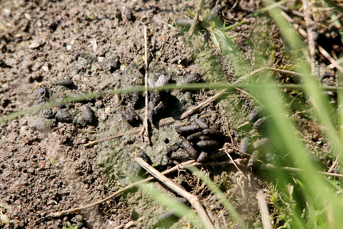 Mannau tŷ bach llygod pengrwn y dŵr gyda baw nodedig gwyrdd neu du (maint a siâp ‘tic-tac’).